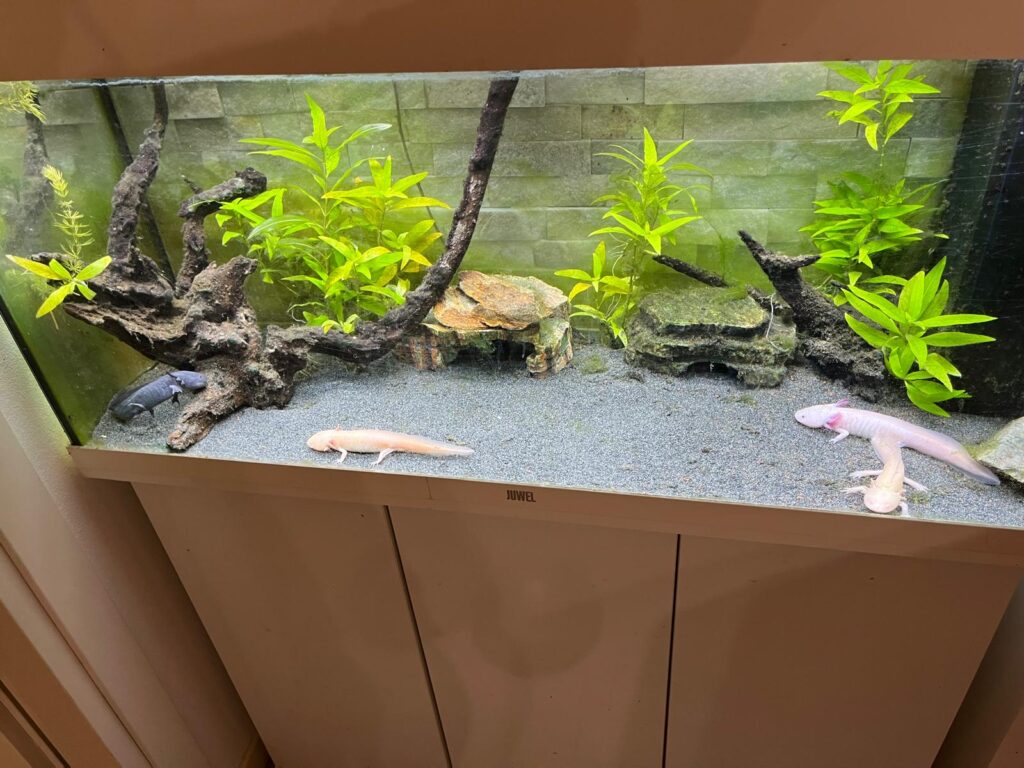 Prima di introdurre un Axolotl in casa, è fondamentale predisporre un acquario adatto e ben equilibrato. Un esemplare adulto necessita di una vasca di almeno 80 centimetri di lunghezza, ma l’ideale sarebbe una da 100 × 50 centimetri, con una colonna d’acqua di circa 40 centimetri. In uno spazio simile possono convivere anche due individui, mentre per gruppi più numerosi è necessario aumentare proporzionalmente le dimensioni della vasca.