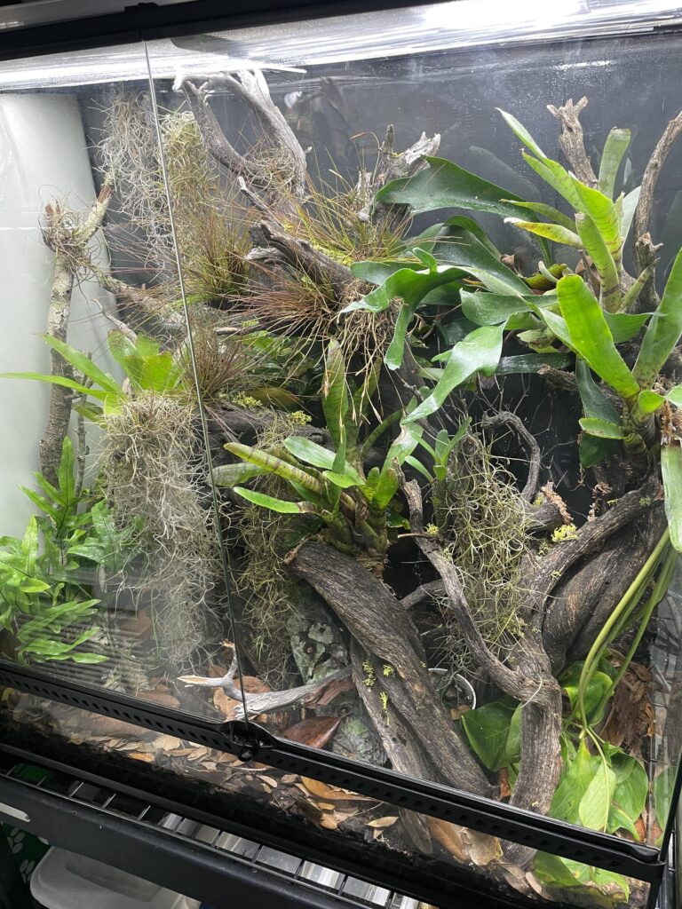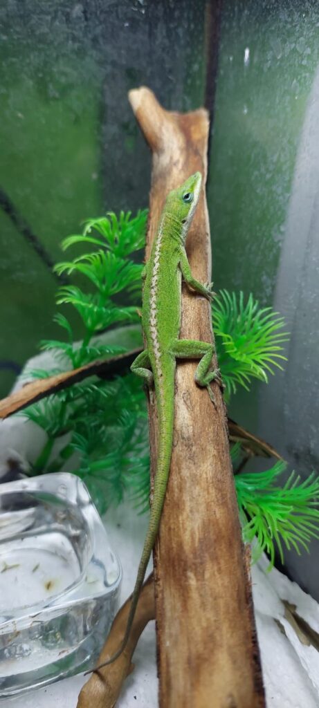 Gli arredi servono a stimolare i comportamenti naturali dell’anolide. Devono includere rami, viti, cortecce e rifugi. L’uso di piante vive contribuisce a mantenere l’umidità e offre nascondigli naturali. Le piante consigliate sono: dracena, pothos, ficus, hibiscus, philodendron, felce, bromelia e tillandsia. È possibile inserire fondali 3D o pannelli in sughero per migliorare l’aspetto e favorire l’arrampicata.