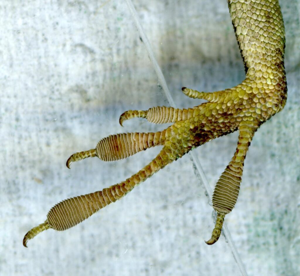 Queste spatule sfruttano le forze di Van der Waals per aderire alle superfici lisce (come gli altri gechi arboricoli) anche se non perfettamente. A differenza invece di altri gechi arboricoli possiede anche delle unghie, che permettono una presa e maggiore aderenza su cortecce e sul terreno.